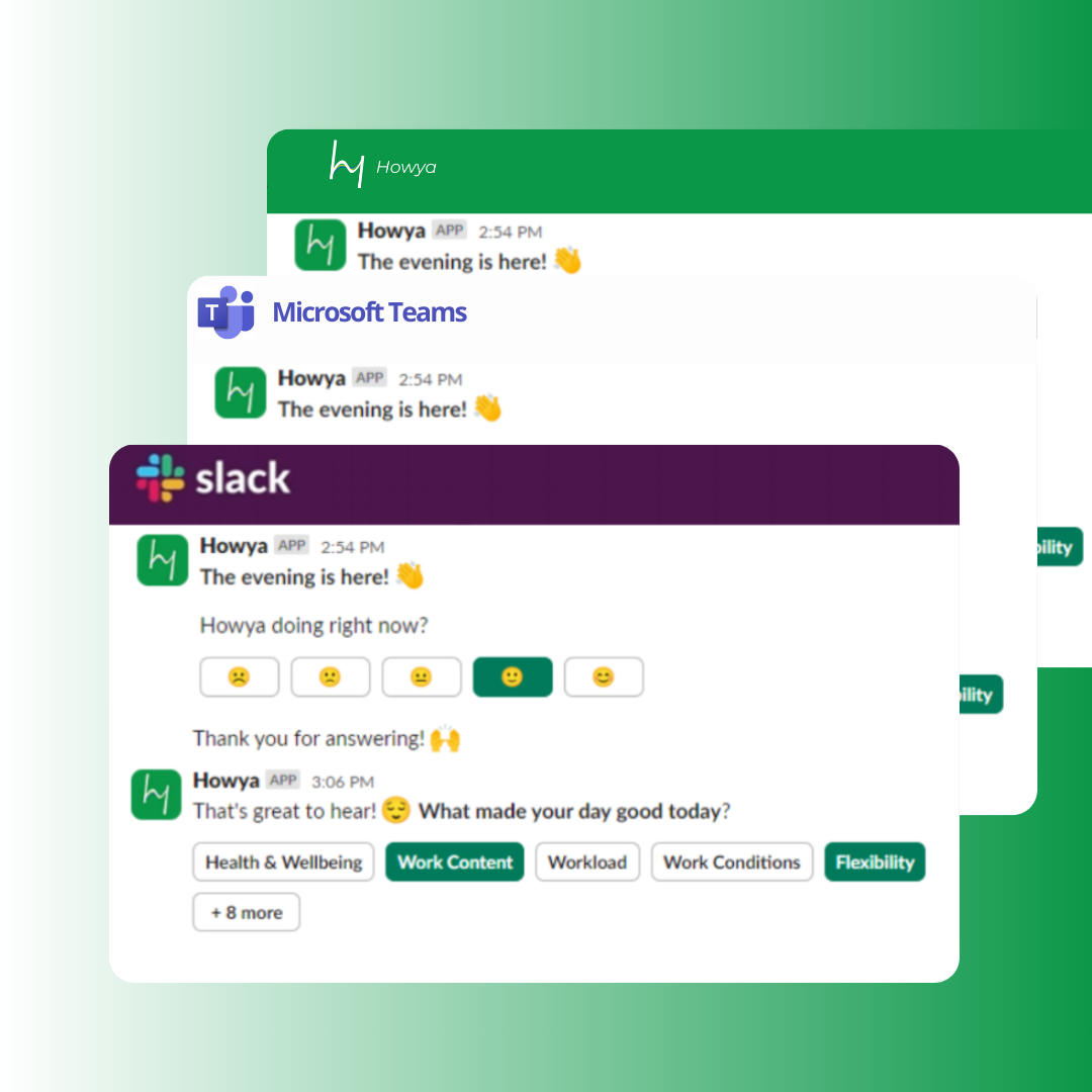 Our pulse surveys can be integrated into Slack and Teams or used via our personalised app